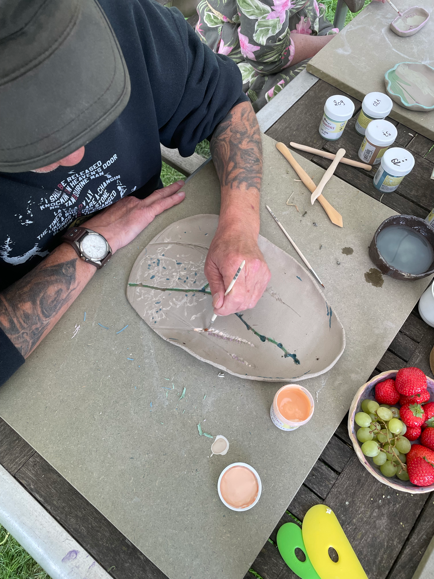 met onze handen, zonder draaischijf, maken we een bord of schaal in klei dat we versieren met afdrukken van planten. Je handgemaakte stuk kan je met onderglazuur afwerken volgens jouw unieke stijl.